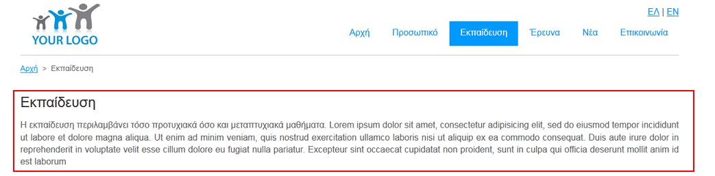 1. Μορφή 1 - Αποτελείται από 1 κεντρική στήλη προβολής των περιεχομένων στην περιοχή MAIN CONTENT του template (βλέπε Εικόνα 1). Παράδειγμα σελίδας της οποίας το περιεχόμενο προβάλλεται σε μία στήλη φαίνεται στην εικόνα που ακολουθεί.