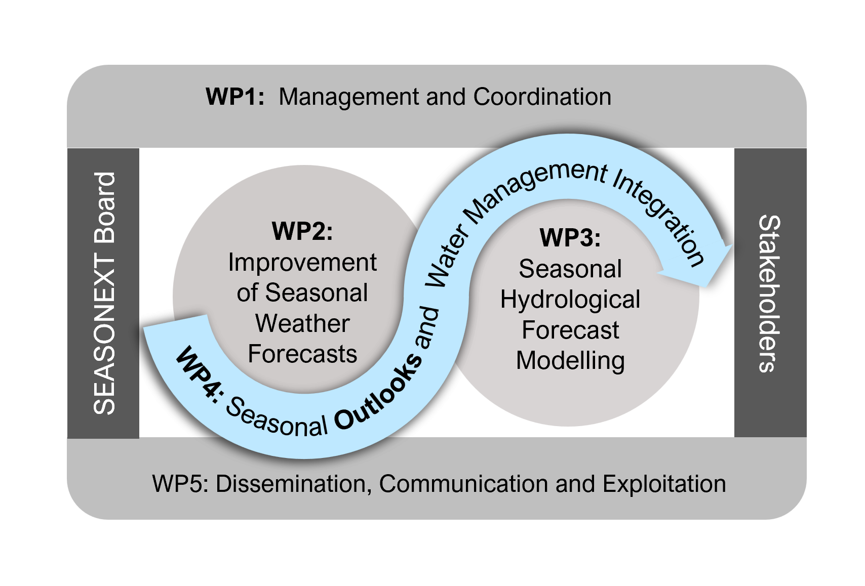 SEASONEXT is structured in five Work Packages (WPs) that form an end-to-end chain from seasonal climate prediction to hydrological outlooks, decision support, and uptake by stakeholders.